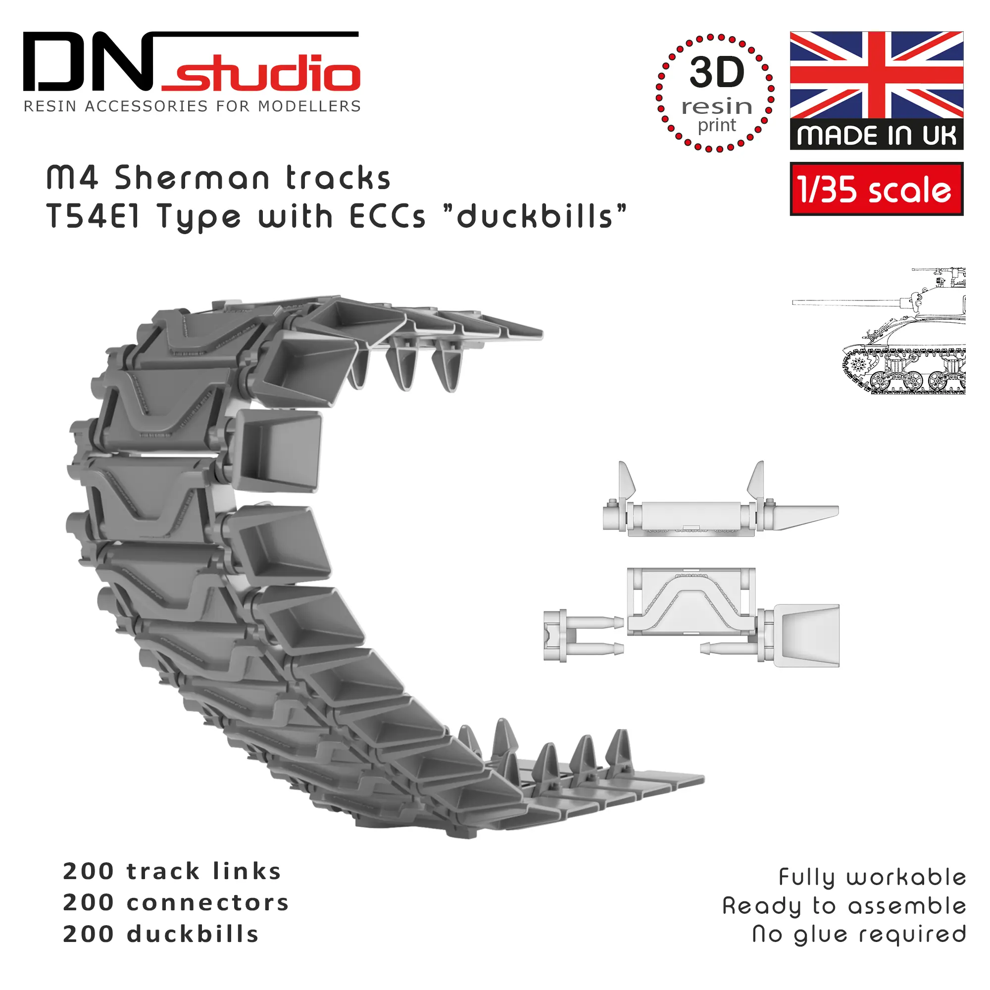 - 1/35 scale Sherman tank workable tracks T54E1 type with ECCs "duckbills"