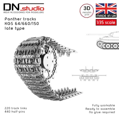 The product is a 1/35 scale workable track set for the WWII Panzerkampfwagen V - Panther german tank late pattern. This resin-printed replica is designed for a Tamiya, Takom, RFM, Meng, Das Werk and Dragon scale modeling kits. This high‑quality resin printed tracks set delivers unmatched precision and value. Perfect for modelers and military vehicles enthusiasts seeking realistic detail without a premium price tag.
