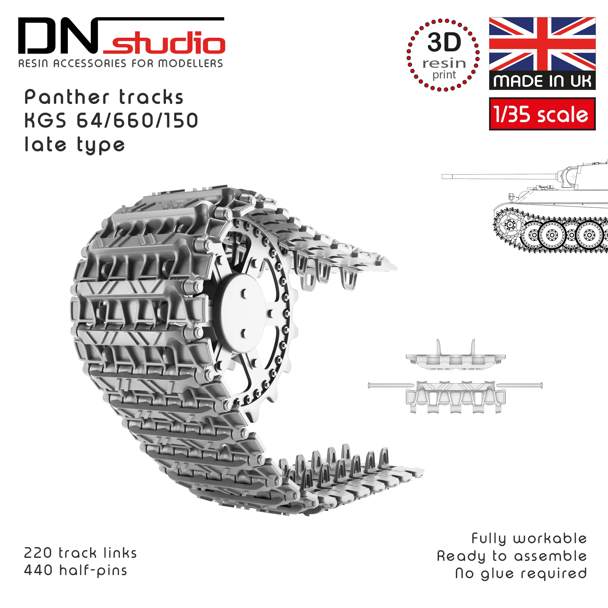 The product is a 1/35 scale workable track set for the WWII Panzerkampfwagen V - Panther german tank late pattern. This resin-printed replica is designed for a Tamiya, Takom, RFM, Meng, Das Werk and Dragon scale modeling kits. This high‑quality resin printed tracks set delivers unmatched precision and value. Perfect for modelers and military vehicles enthusiasts seeking realistic detail without a premium price tag.